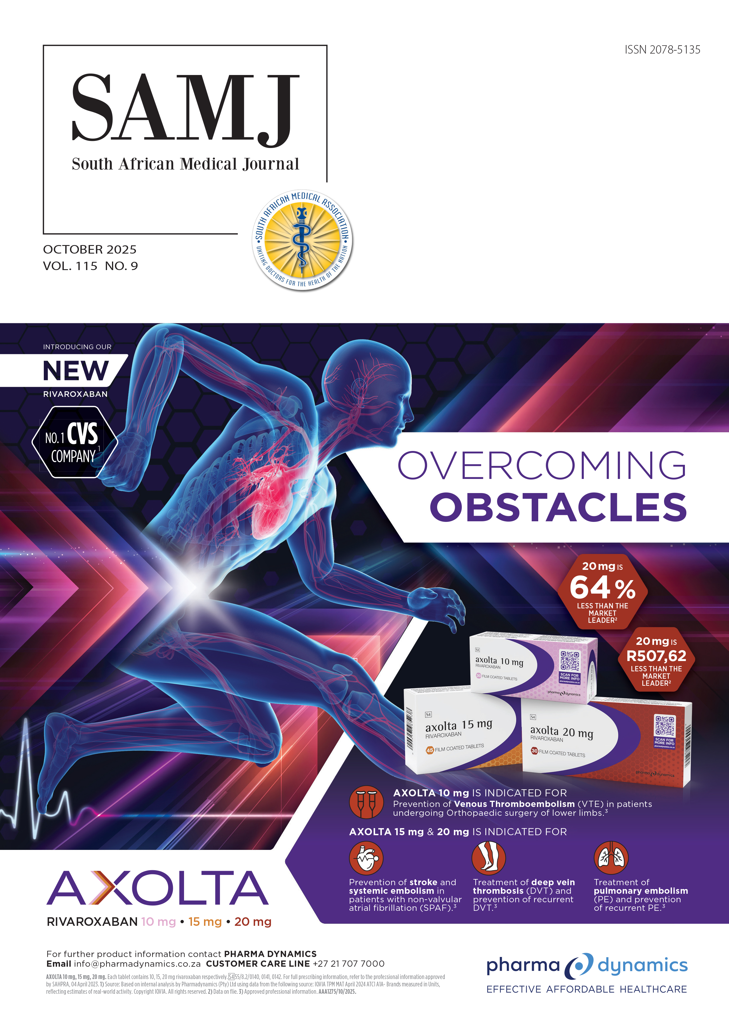 The SAMJ is published under an Attribution-Non Commercial International Creative Commons Attribution (CC-BY-NC 4.0) License. Under this license, authors agree to make articles available to users, without permission or fees, for any lawful, non-commercial purpose. Users may read, copy, or re-use published content as long as the author and original place of publication are properly cited.